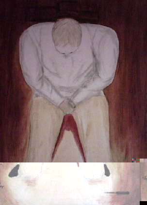2005 - 60x80cm (gerahmt) - Acryl auf Leinwand. -----Ruhe-----"Ich schlag nach Dir - hau ab von MIRIch tret nach Dir - so weh tut's mir!Ich prügel Dich - mit aller KraftUnd HOFF', dass es Dir Schmerzen macht!Ich kämpfe nur noch gegen Dich anDas mach' ich noch - solang ich kann.Ich wehre mich - solang' ich mussZum bittren Ende - traurig SchlussIch kann nicht mehr lachenIch mag nicht mehr schreienGekämpft mit dem DrachenJetzt endlich alleinMein Herz liegt in FetzenAuch Hoffnung - auch MutWie gern blieb ich liegenDann wär's endlich gutNoch hab ich Kraft - Noch hab ich TränenDoch - ach so sehr - nach Ruhe sehnen!"(c)opyright by AnneMarie